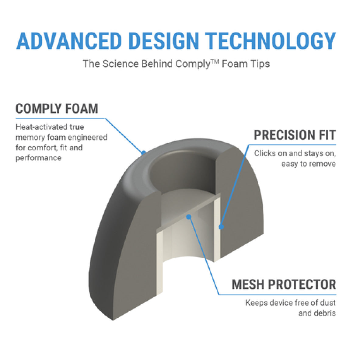 Comply Foam Tips offer excellent noise isolation. Actual attenuation depends on earphone design and frequency. The foam's passive noise-reduction technology seals out unwanted ambient sound and funnels pure music directly into the ear canal.
